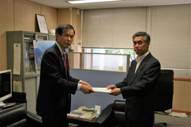 平成28年熊本地震による土砂災害緊急調査に基づく緊急提言石川芳治(公社)砂防学会会長より西山幸治国土交通省砂防部長へ提出 (平成28年5月6日 於:国土交通省水管理・国土保全局砂防部長室)