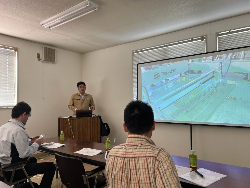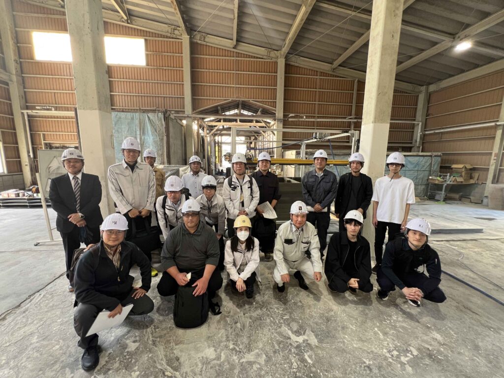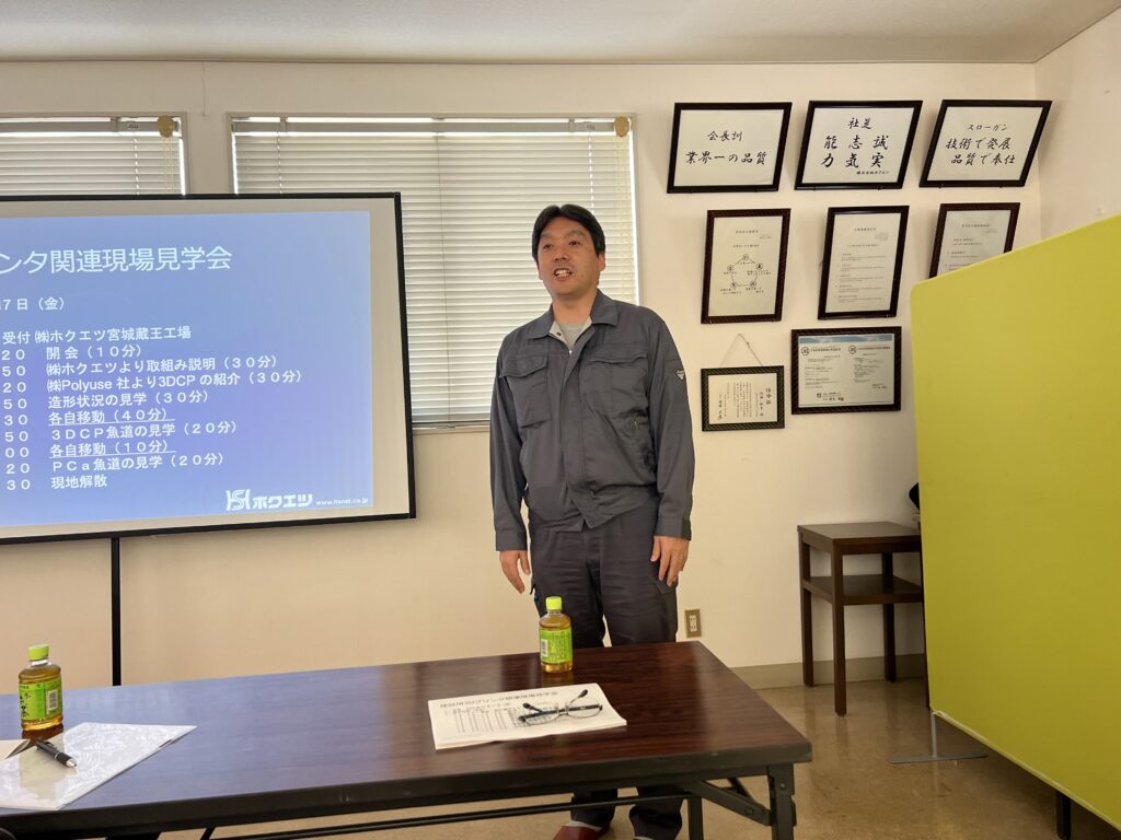 見学会では、まず㈱ホクエツより同社の取り組みや工場の概要について説明が行われ、その後、㈱Polyuseより3Dコンクリートプリンター(3DCP)技術の紹介がありました。実際の3Dプリント造形の状況を間近で見学し、参加者からは活発な質疑応答がなされました。